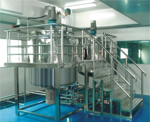 適用物料的加熱。溶解、均質乳化,真空脫氣。是洗面奶、藥資化放品等中乳劑膏器類產品生產制造的機器設備。一整套機器設備配有油相鍋、水相鍋、乳化鍋、操控平臺、控制柜。